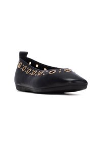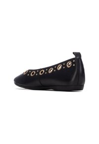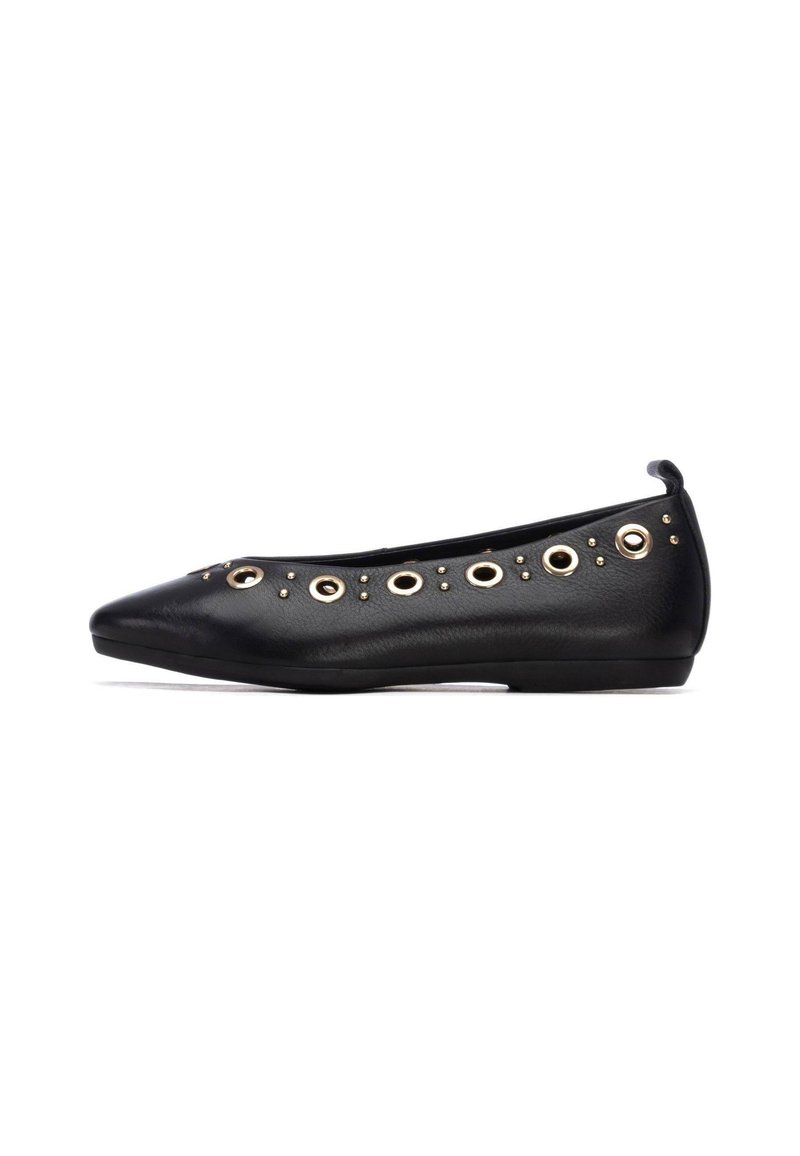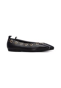 Bailarina plana de cuero negro con punta puntiaguda, detalles de ojales dorados en la parte superior y superficie texturizada suave. Diseño minimalista.