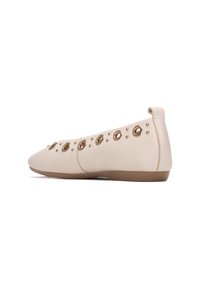 Zapato plano beige con punta redondeada, material sintético liso y detalles circulares dorados a lo largo del costado, con un diseño de tacón bajo.