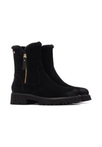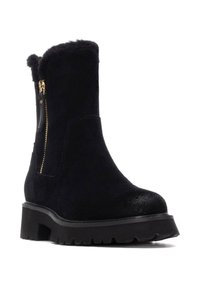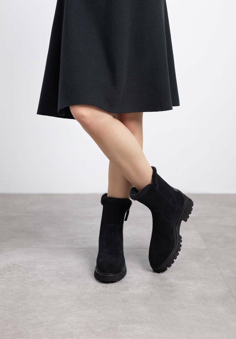 Botas de tobillo de ante negro con un cuello de piel sintética, suela de goma texturizada y cremallera lateral, combinadas con una falda negra.