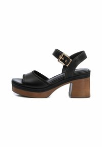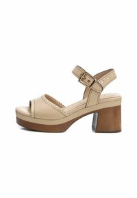 Sandalias de plataforma beiges con un tacón de madera grueso, puntera abierta y correa para el tobillo con un hebilla metálica. Textura de cuero suave con detalles de costura.