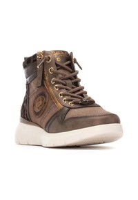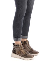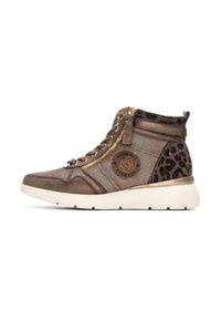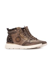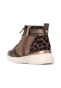 Zapatillas altas de bronce metálico con cordones en la parte delantera, cremallera lateral y acento de estampado de leopardo en el talón. Tejido texturizado y suela acolchada.