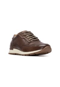 Zapatilla deportiva de cuero marrón con puntera redonda, diseño con cordones, detalles perforados y suela exterior beige contrastante. Estilo simple y casual.