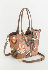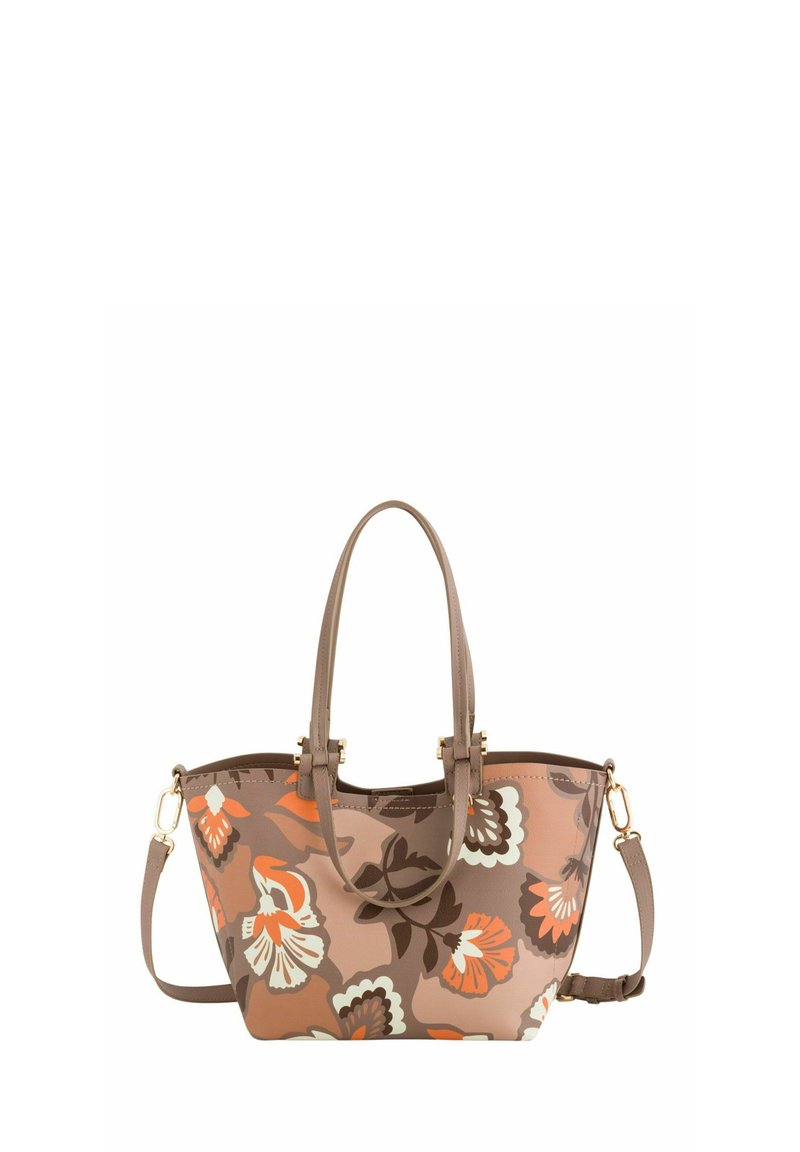 Bolso marrón con estampado floral en tonos naranja, crema y marrón oscuro, con dos asas superiores y correa de hombro desmontable con herrajes dorados.