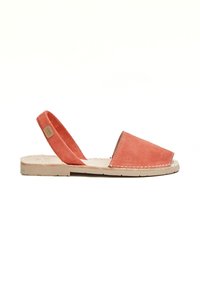 Sandalias de ante beige tipo slingback con puntera cerrada, suela de goma plana y detalles de costura mínimos. Textura suave y diseño sencillo.