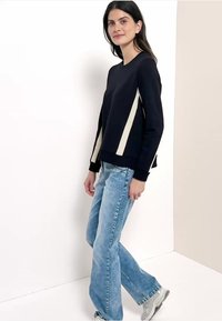 Joven con cabello largo y castaño, vestida con un top negro de manga larga con franjas blancas en los costados y jeans azules, con las manos en los bolsillos, sonriendo.