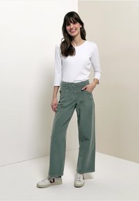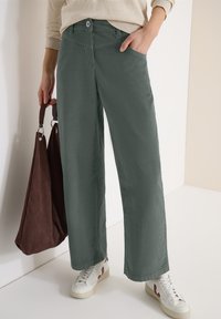 Persona con pantalones anchos verdes, suéter beige, zapatillas blancas, llevando un gran bolso marrón y con una mano en el bolsillo.