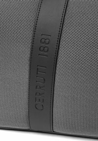 Bolsa de lona gris con asas de cuero negro, correa para el hombro y detalles, con "CERRUTI 1881" grabado en las correas frontales.