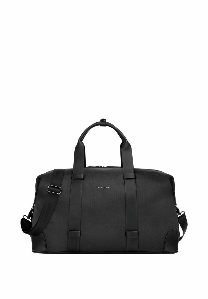 Bolsa tipo duffel negra de Cerruti 1881 con dos asas superiores, correa de hombro ajustable y detalles de correas verticales en el frente.