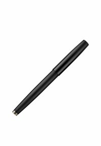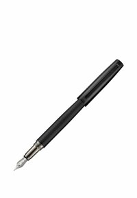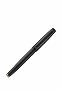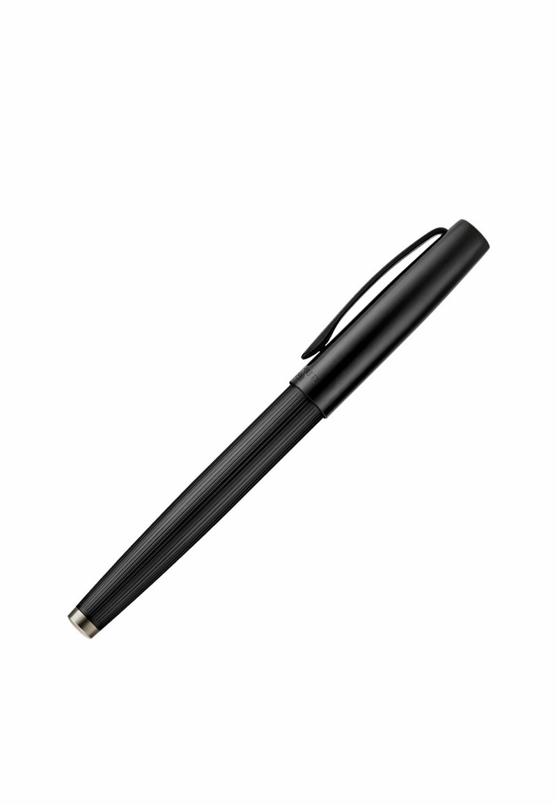 Pluma estilográfica negra acanalada con clip en la tapa y punta plateada, mostrada sobre un fondo blanco.