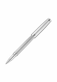 Bolígrafo de bola de metal plateado con cuerpo acanalado y tapa lisa separada grabada con "CERRUTI 1881", mostrado sin tapa sobre fondo blanco.