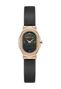 Reloj ovalado de oro rosa con esfera de nácar negro, bisel de diamantes, marcadores minimalistas y correa de cuero negro texturizado con la inscripción "CERRUTI 1881".