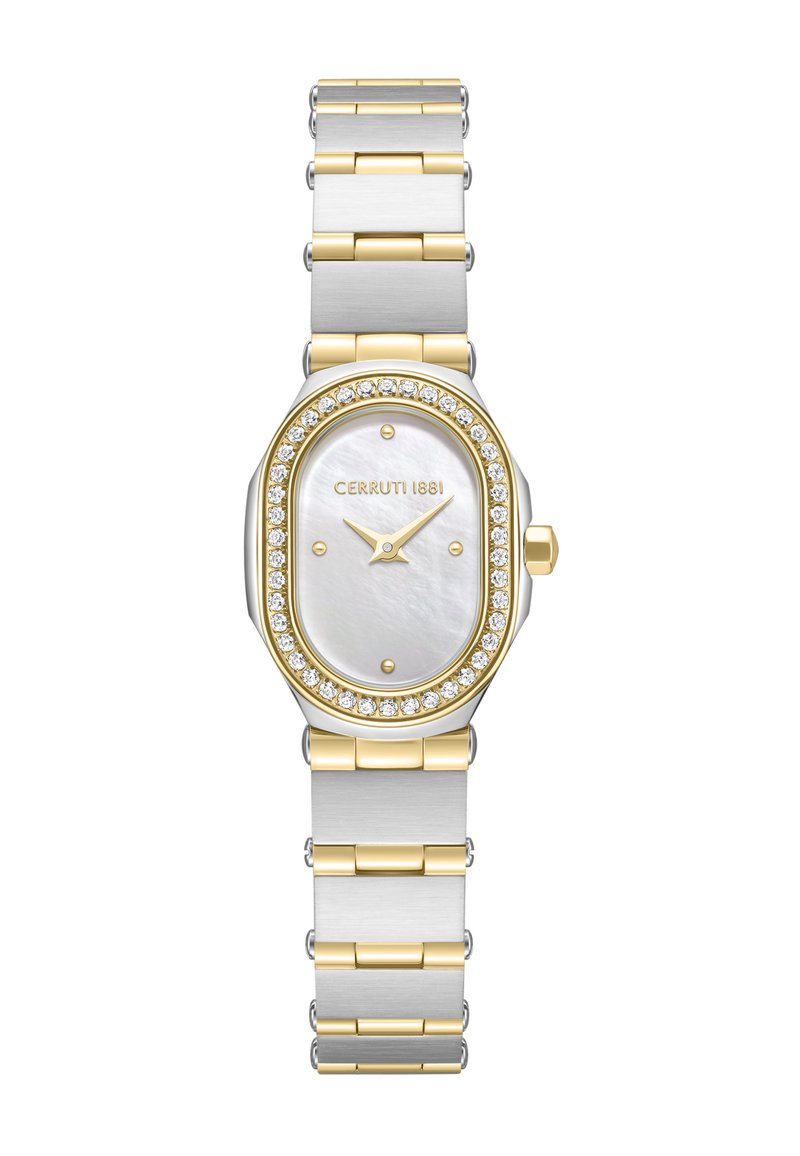 Reloj de pulsera Cerruti 1881 en tono dorado y plateado con esfera ovalada de nácar blanco, bisel de cristal y marcadores y manecillas de hora dorados.