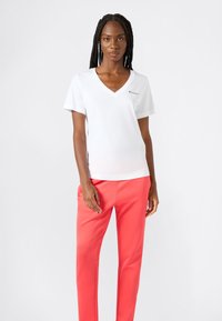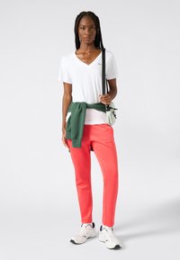 Camiseta blanca con cuello en V, mangas cortas y un pequeño logo; combinada con pantalones rectos de color coral vibrante. Tejido suave, diseño minimalista.