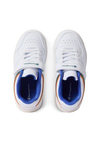 Zapatilla blanca de corte bajo con suela azul, rayas verdes y naranjas, forro interior azul, cierre de velcro y logotipos de Champion en el lateral y el talón.