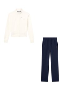 Chaqueta roja con cremallera hecha de un material suave, combinada con pantalones rectos azul marino y zapatillas blancas. Diseño sencillo sin patrones.