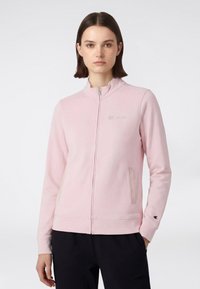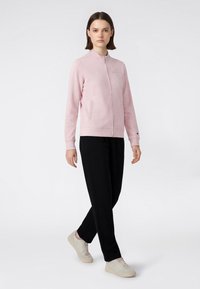 Mujer de pie vestida con una chaqueta rosa claro con cremallera, pantalones negros y zapatillas beige sobre un fondo blanco liso.