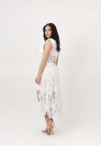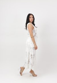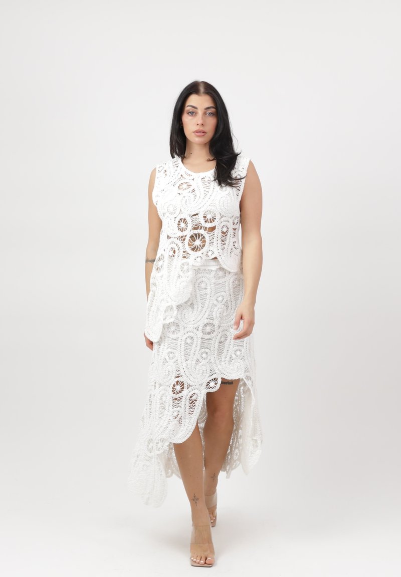 Mujer de cabello oscuro con top sin mangas de encaje blanco y falda alta-baja a juego, posando descalza sobre un fondo liso.