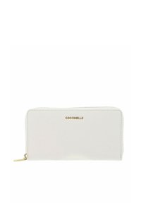 Billetera de cuero negro con acabado texturizado, herrajes dorados y cierre con cremallera que presenta una pequeña pestaña de tiro. El nombre de la marca está grabado.
