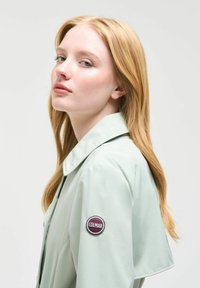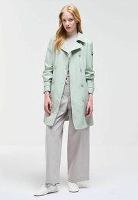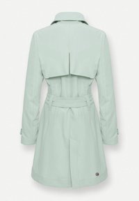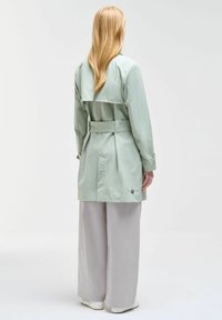 Mujer joven con cabello largo y rubio, vestida con un abrigo trench ligero color verde con cinturón, de pie contra un fondo claro y sencillo.