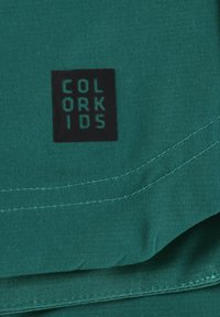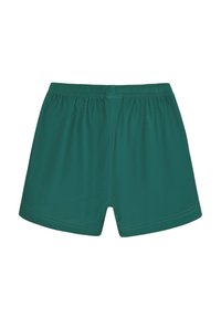 Bañador corto verde azulado con cintura elástica, textura suave y detalles sutiles de costura. Pequeño logo de la marca en el lado derecho inferior.