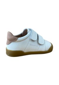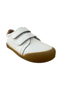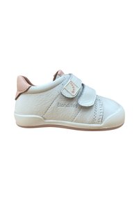 Zapato para niño pequeño de cuero blanco con dos correas de velcro, parche en el talón beige y suela de goma marrón, con la marca "Blanditos" en el lateral.