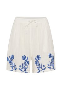 Pantalones cortos de tela texturizada rosa con bordado floral en azul marino, cintura elástica con cordón y bolsillos laterales, usados con un top a juego.