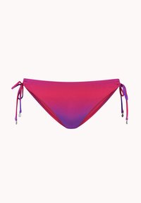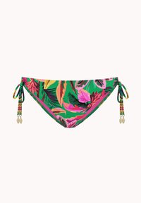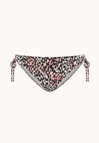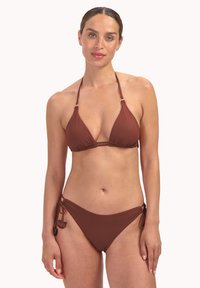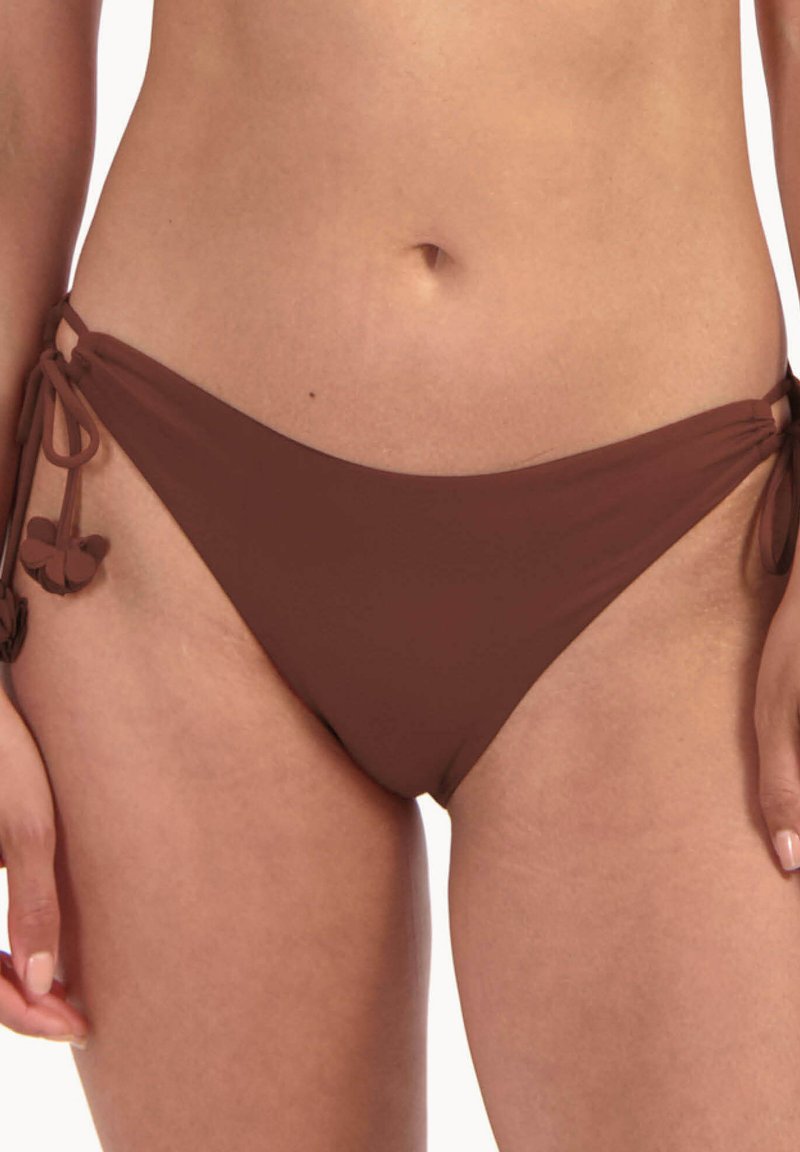 Parte inferior de bikini marrón con lazos laterales, usada por una persona que muestra el torso y la parte superior de los muslos sobre un fondo blanco.