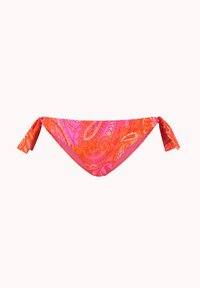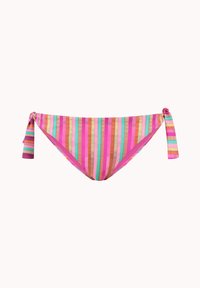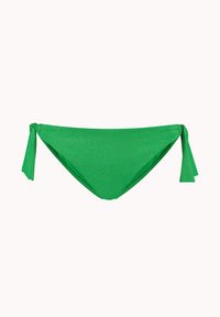 Conjunto de bikini amarillo con acabado texturizado y acanalado. El top tiene tirantes anchos y escote pronunciado; la parte inferior se ata en las caderas.