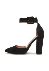 Zapato de tacón alto de ante marrón con punta puntiaguda, correa en el tobillo, hebilla cuadrada y tacón grueso. Forro interior suave para mayor comodidad.