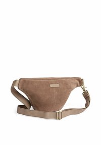 Bolso de cinturón de ante marrón con un diseño plano, cierre con cremallera y bucle lateral. Presenta una textura suave y un estilo minimalista.