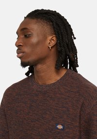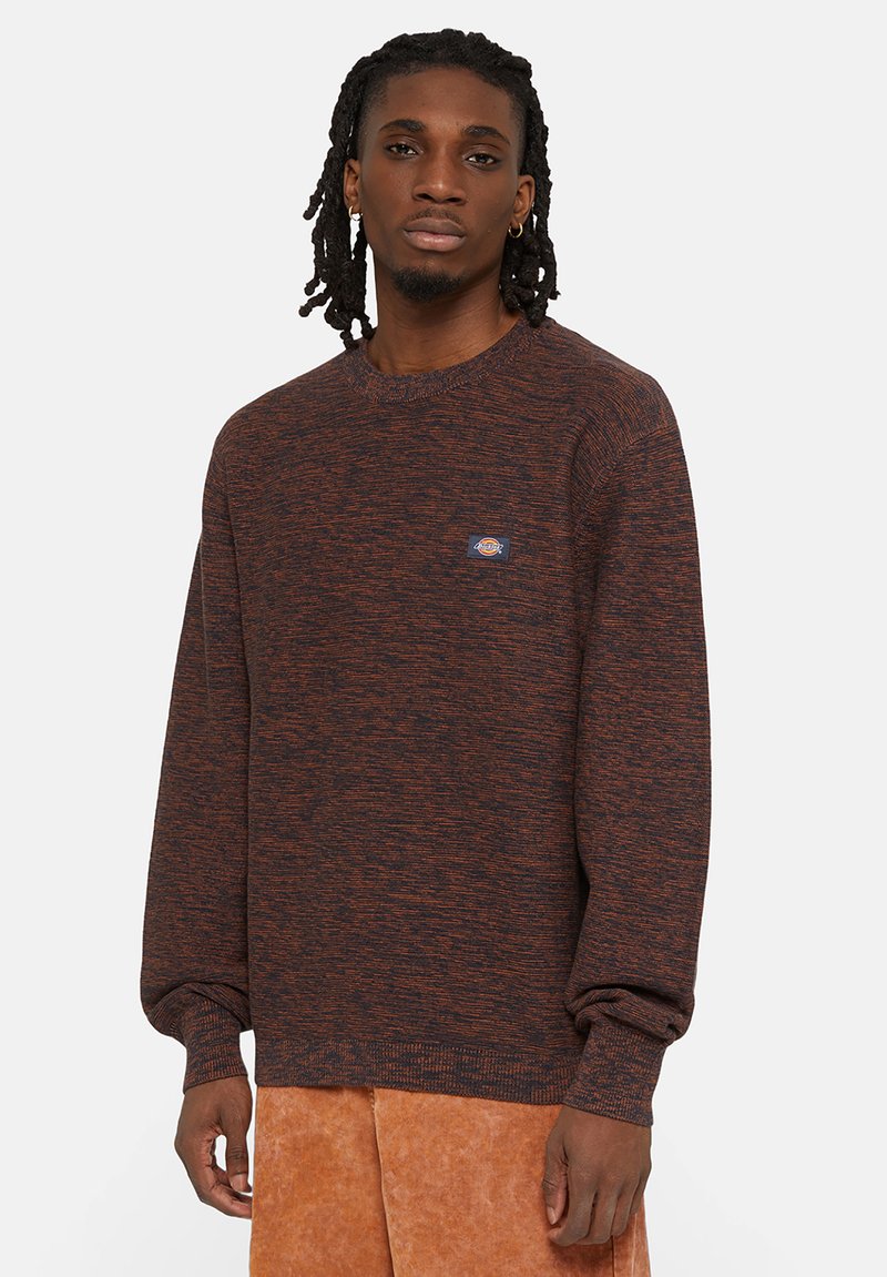 Sudadera de punto con motas marrones y naranjas, con cuello redondo y puños acanalados. Presenta un pequeño parche con logo en el pecho.