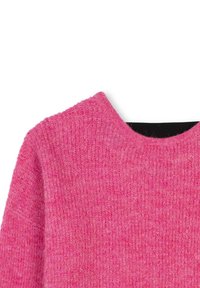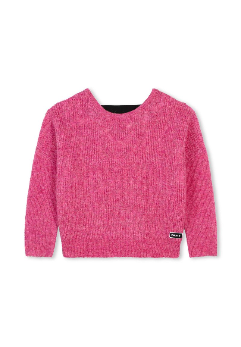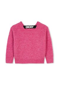 Suéter de punto rosa con cuello redondo, mangas largas y un acabado texturizado. Presenta una pequeña etiqueta negra con el logo de DKNY en el lado inferior.