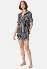 Mujer descalza de pie, vistiendo un conjunto de pijama que consiste en una camisa de manga corta con botones y pantalones cortos a cuadros en blanco y negro a juego.