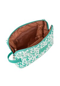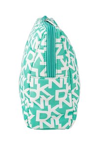 Bolsa DKNY en color azul verdoso con un patrón repetitivo de logo blanco, acolchada, con cierre de cremallera y asa lateral para un fácil transporte.