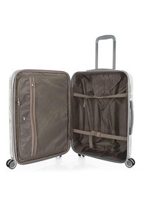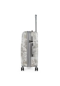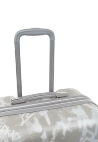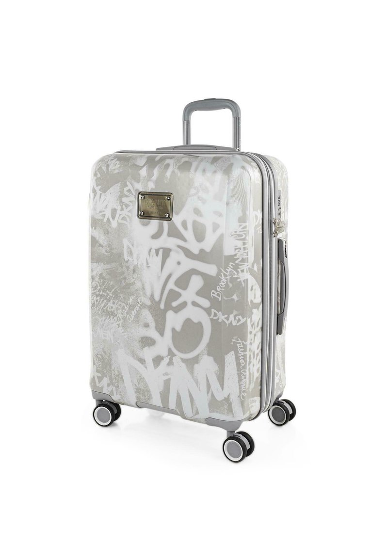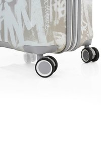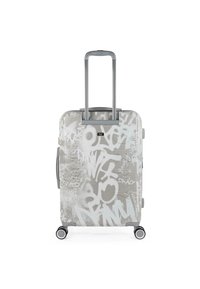 Maleta rígida en gris claro con patrones de graffiti en blanco, que cuenta con un mango telescópico y cuatro ruedas negras para una fácil movilidad.