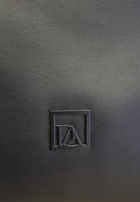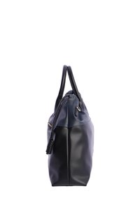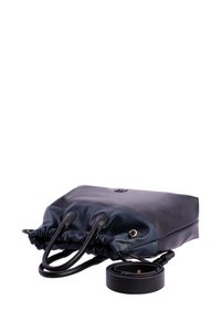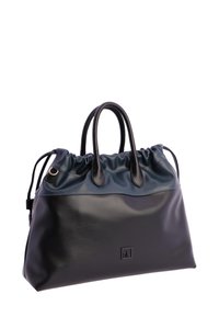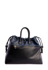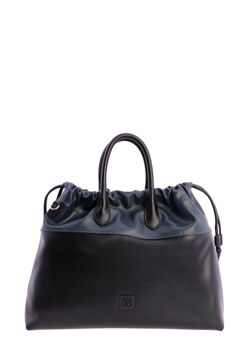 Bolso de mano negro y azul marino con parte superior fruncida, textura suave, asas dobles y discreto detalle de logo. Presenta un diseño elegante y acentos modernos.