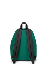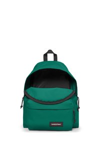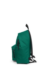 Mochila de nailon verde con parte superior curva, bolsillo delantero y parche con logotipo. Cuenta con correas negras y tela resistente para uso al aire libre.