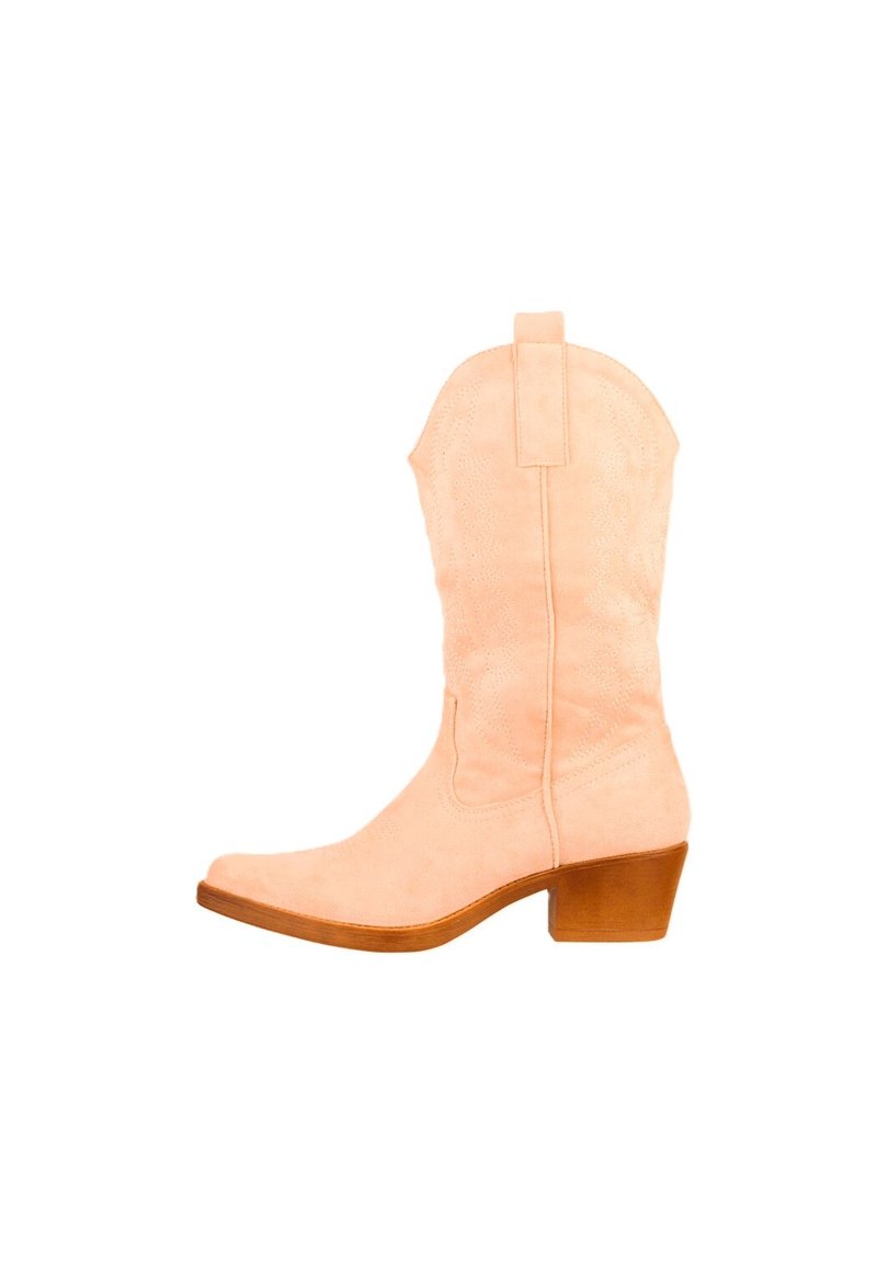 Bota vaquera de ante rosa claro con punta puntiaguda y tacón apilado. Presenta costuras decorativas y una lengüeta para tirar en la parte superior.