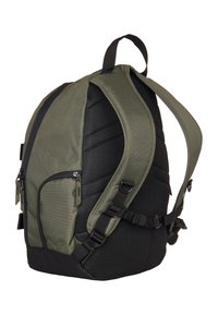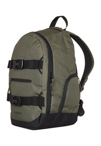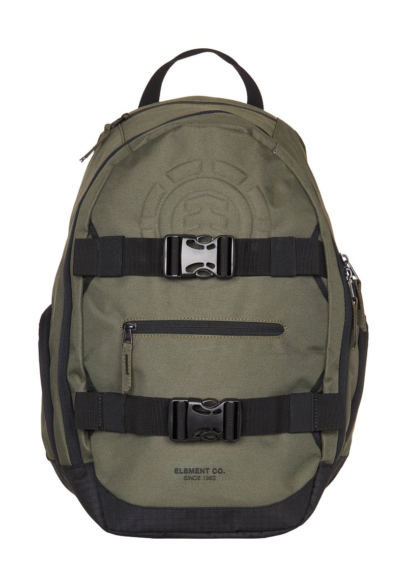 Mochila verde oliva con hebillas negras, bolsillo frontal con cremallera, asa superior y logo "Element Co. Desde 1992" en la parte inferior.