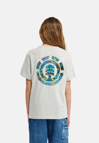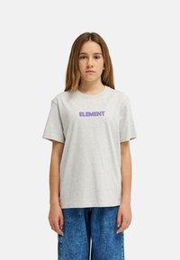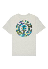 Joven de pie con camiseta gris claro "ELEMENT", vaqueros azules holgados y zapatillas negras, sobre fondo blanco liso.