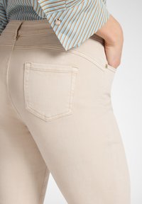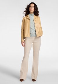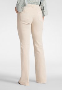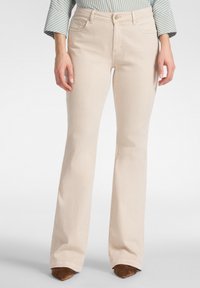 Mujer con pantalones acampanados beige de talle alto, camiseta de manga larga a rayas y zapatos marrones de punta, de pie sobre un fondo claro y liso.