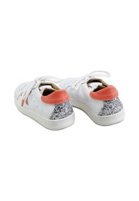 Zapatilla deportiva de cuero blanco con estrella coral en el lateral, lengüeta coral en el talón, detalle de purpurina plateada en la parte posterior y cordones blancos.