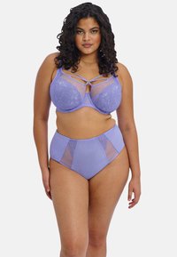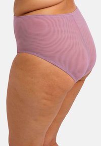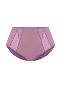 Braguitas de talle alto en color lavanda con paneles de malla translúcida y detalles de encaje en los laterales. Textura suave que ofrece un ajuste cómodo.