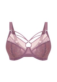 Un sujetador de encaje verde menta con paneles transparentes, que presenta cintas decorativas y soporte con aro. Los detalles incluyen encaje floral y acentos metálicos.