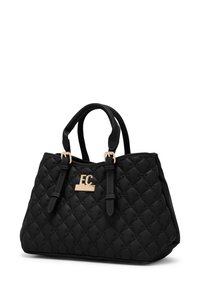 Bolso negro acolchado con herrajes dorados y logo, que cuenta con dos asas y una correa de hombro desmontable. Textura lisa y forma estructurada.