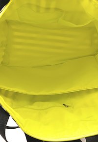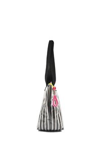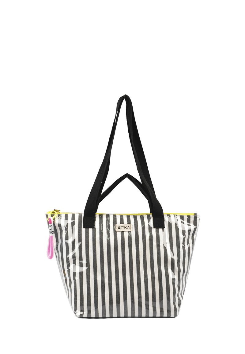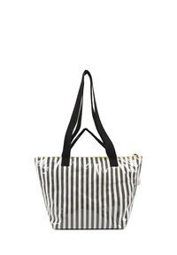 Bolsa tote transparente con rayas verticales en blanco y negro, asas negras y un detalle en forma de cremallera amarilla. Presenta un logo en la parte frontal.
