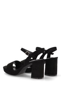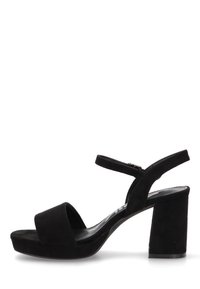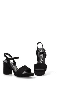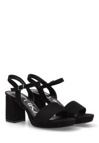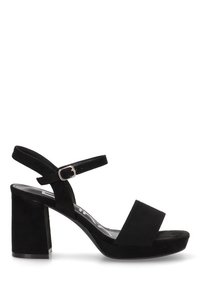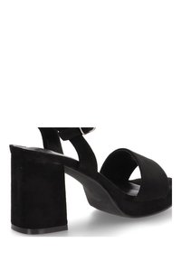 Sandalia de tacón de ante negra con un diseño de doble tira, punta abierta y tacón grueso. Hebilla ajustable en el tobillo con herrajes de metal.