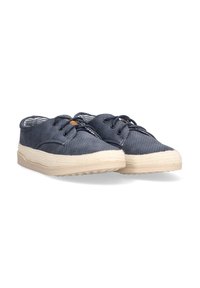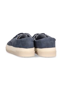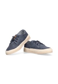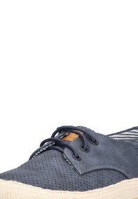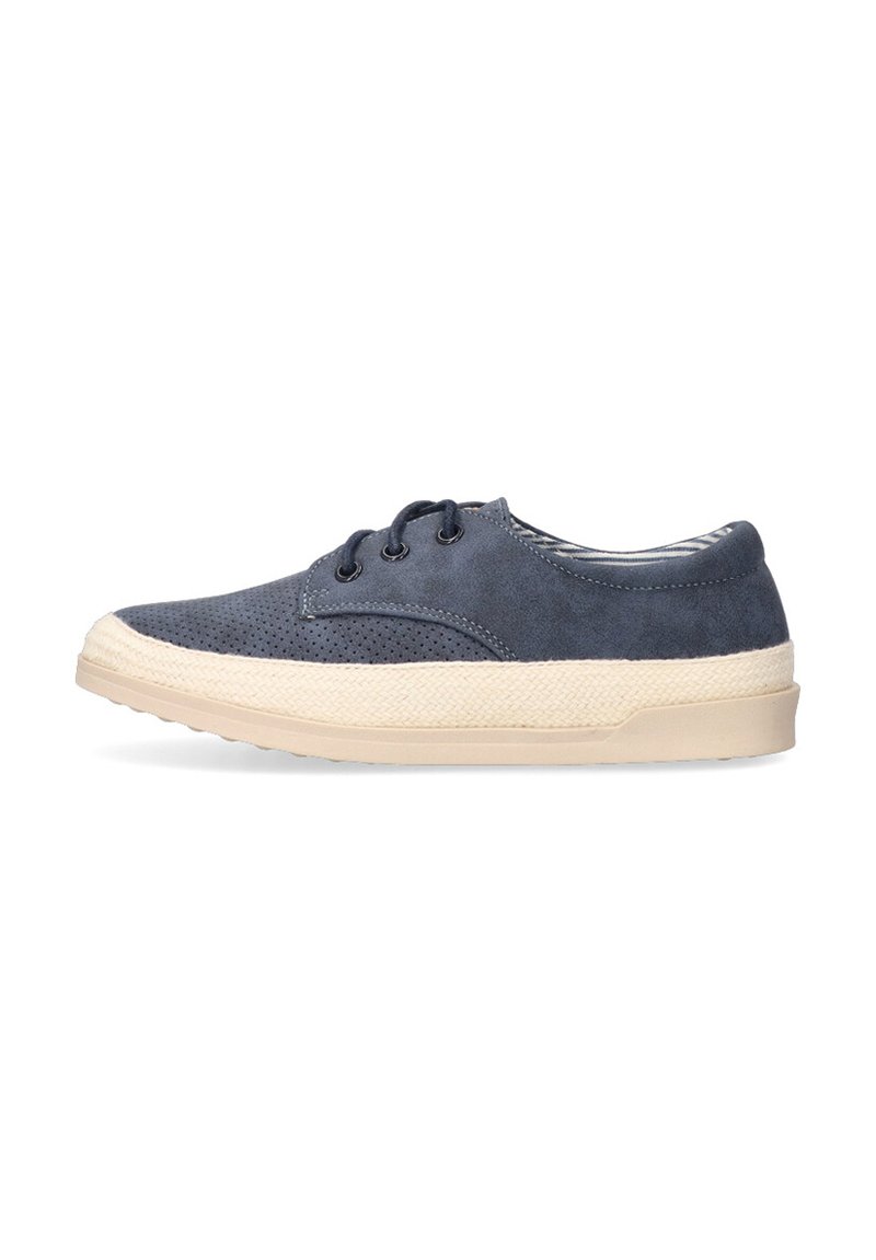 Zapatilla de ante azul con diseño perforado, puntera redonda y suela de goma beige. Presenta dos ojales y un forro interior texturizado.