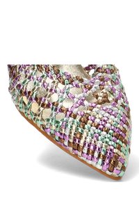 Zapato de tacón con punta puntiaguda y tiras trenzadas multicolor, hebilla en tono dorado y tacón ancho metálico brillante.