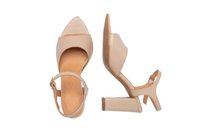 Sandal de tacón alto beige con punta abierta, correa en el tobillo y tacón cuadrado. Material de cuero liso con plantilla de madera natural.